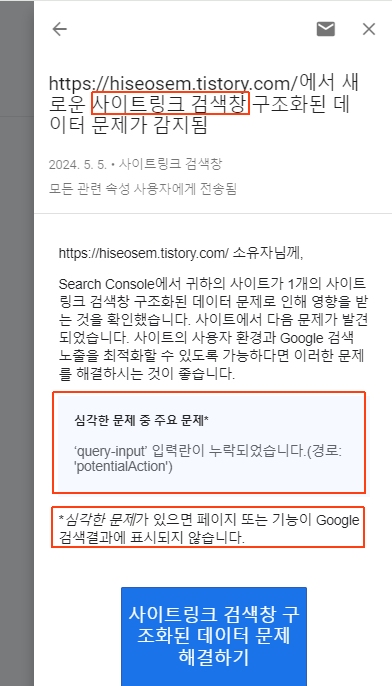 후속조치를 권장합니다. 5월 1일 이후 티스토리 유저들에게 맘고생을 하게 했던 Google의 경고 [‘query-input’ 입력란이 누락되었습니다.]이슈 가 어제 오후 티스토리측에서 수정하면서 해결이 되었습니다. 즉, 메인페이지, 태그페이지, 서치페이지 등에 있던 구조화 데이터 소스 <script type=”application/ld+json”> {“@context”:”http://schema.org”,”@type”:”WebSite”,”url”:”/”,”potentialAction”:{“@type”:”SearchAction”,”target”:”/search/{search_term_string}”,”query”:”required name=search_term_string”}} </script> 가 지금은 <script type=”application/ld+json”> {“@context”:”http://schema.org”,”@type”:”WebSite”,”url”:”/”,”potentialAction”:{“@type”:”SearchAction”,”target”:”/search/{search_term_string}”,”query-input”:”required name=search_term_string”}} </script> 로 수정되면서 오류가 해결되었습니다. 이 소스 또는 이 소스가 삽입된 url을 아래 Google의 구조화 … Read more